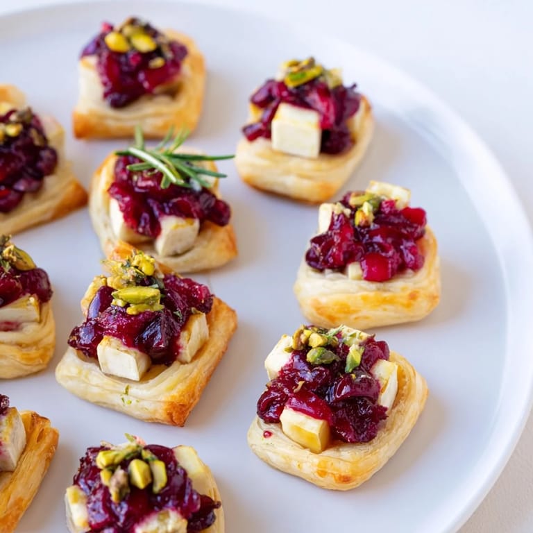 Save A festive, savory tartlet arrangement featuring creamy brie, tangy cranberry sauce, and golden puff pastry, perfect for holiday gatherings.