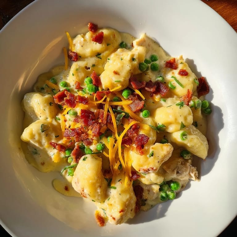 Save Experience the ultimate comfort food: pillowy potato gnocchi coated in a rich, creamy chicken sauce loaded with savory herbs, crispy bacon, and cheddar cheese for irresistible flavor.
