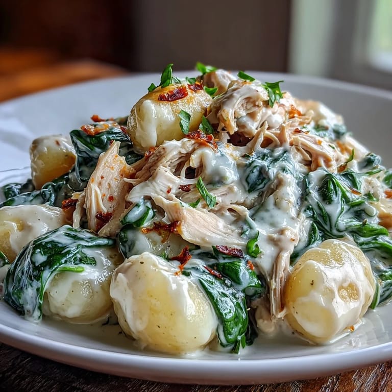Save There's something about the way gnocchi pillows collapse into a cream sauce that makes even a rushed weeknight feel like you've accomplished something in the kitchen. I stumbled onto this particular combination while staring at a half-empty container of spinach and some leftover chicken, wondering what could possibly come together in less than thirty minutes. The answer turned out to be this creamy, garlicky masterpiece that's since become my go-to when I need comfort without the fuss.