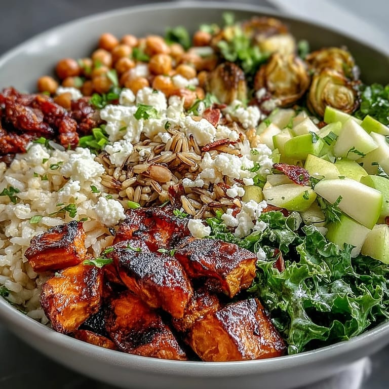 - Brussels sprouts: Trim and halve 1 lb of them—these are what make the bowl feel autumn-specific, and they develop these caramelized, almost candy-like edges when roasted properly.