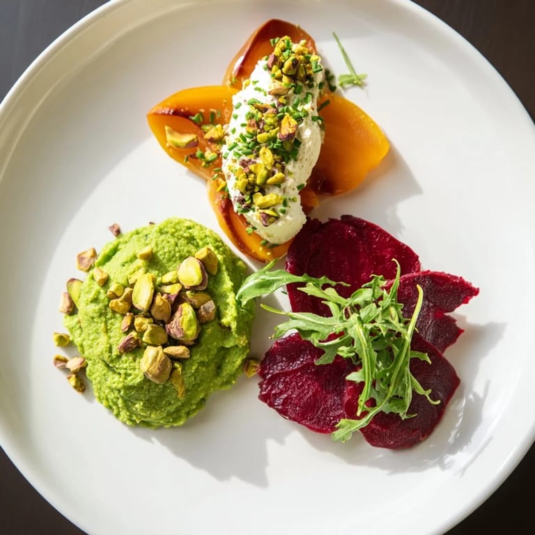 - On each plate, arrange three leaves in a clover shape: one scoop green pea purée, one beet slice, and one quenelle of goat cheese mousse. Garnish with baby arugula, edible flowers, and extra pistachios. Serve immediately.