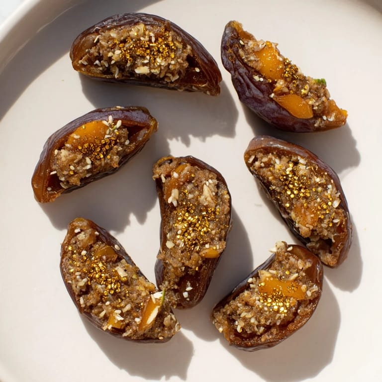 - Warm the honey slightly and brush over the dates for shine Sprinkle with sesame seeds and apply edible gold leaf pieces for a luxurious finish if desired